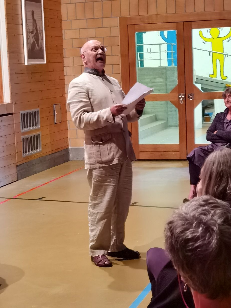 Die melancholisch-heiteren Klänge des Duos untermalten stimmig, was Köbi Gantenbein in seiner unterhaltsamen Lobrede präsentierte: In Form einer musikalischen Lesung liess er Monikas Papierschnitt-Kunst und ihre Motive lebendig werden, er veranschaulichte den Werdegang und die Arbeitsweise der Kunsthandwerkerin, und er bettete alles höchst originell in die traurig-schöne Sage der Fenggin Madrisa ein.